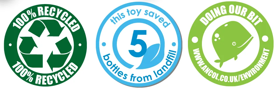 Bæði fyllingin, ytra efnið og bómullarreipið er framleitt úr endurunnu plasti, meðal annars plastflöskum.