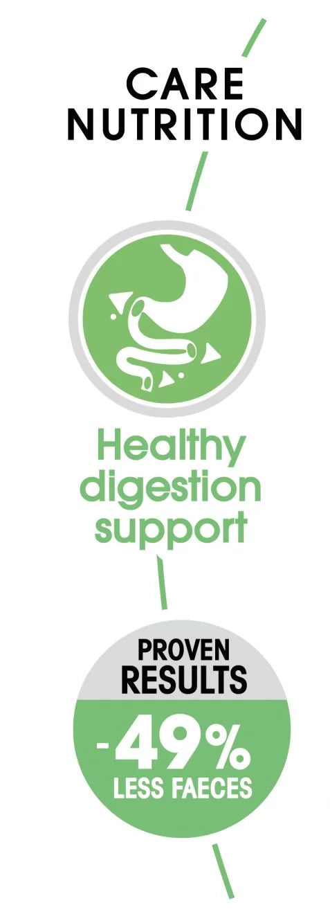 Inniheldur auðmeltanleg prótein (LIP) sem léttir á viðkvæmu meltingarkerfi og dregur úr lykt af hægðum. Inniheldur einnig fructo-oligo-saccharides (FOS) ásamt psyllium trefjumsem styrkja meltingarveginn og stuðla að jafnvægi í þarmaflórunni.